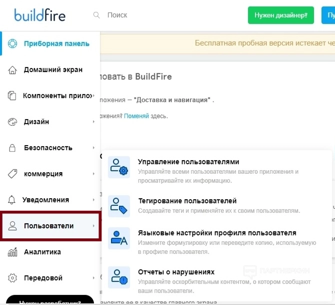 Основная панель меню находится слева. Именно по данным разделам и придется полностью настраивать будущее приложение.