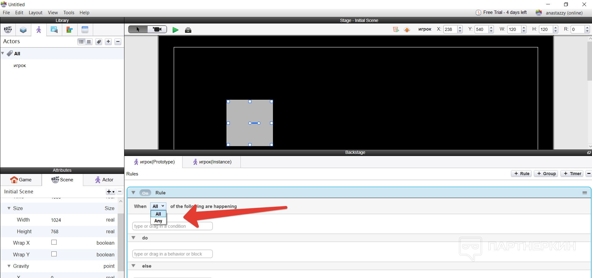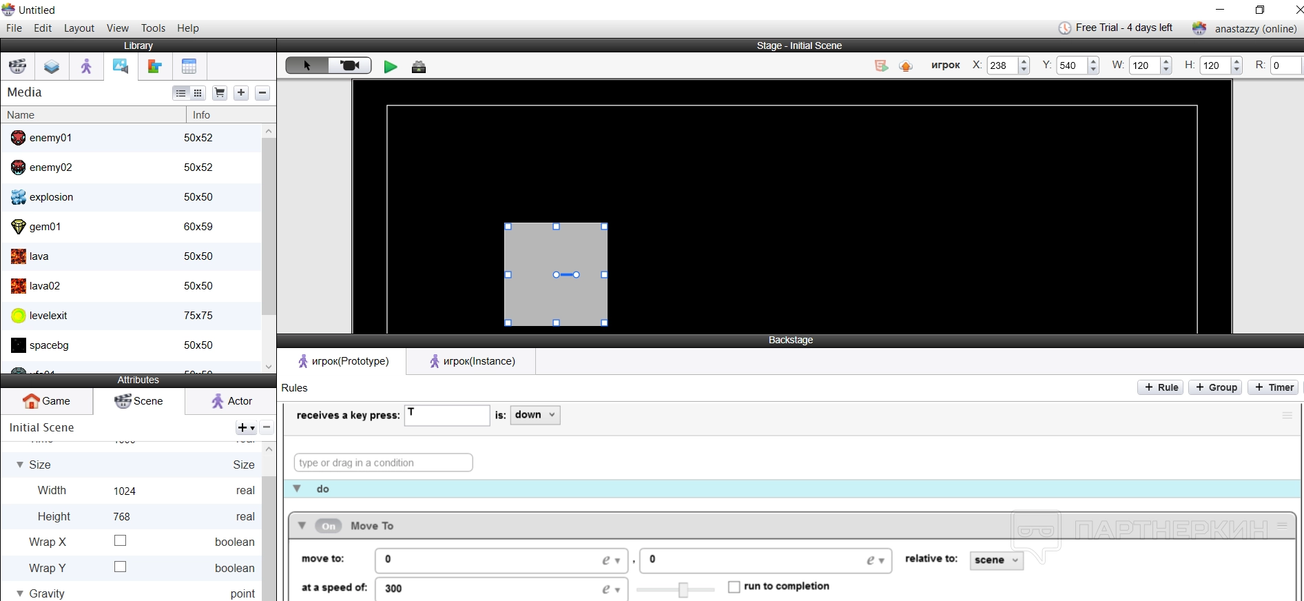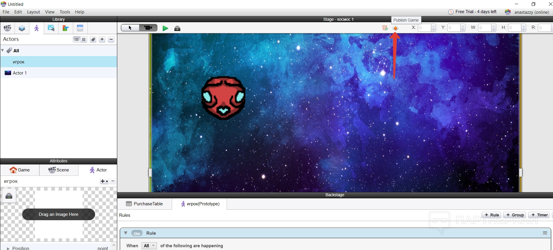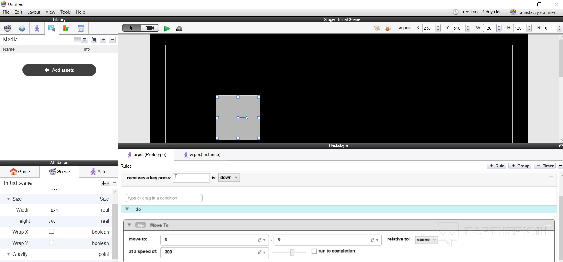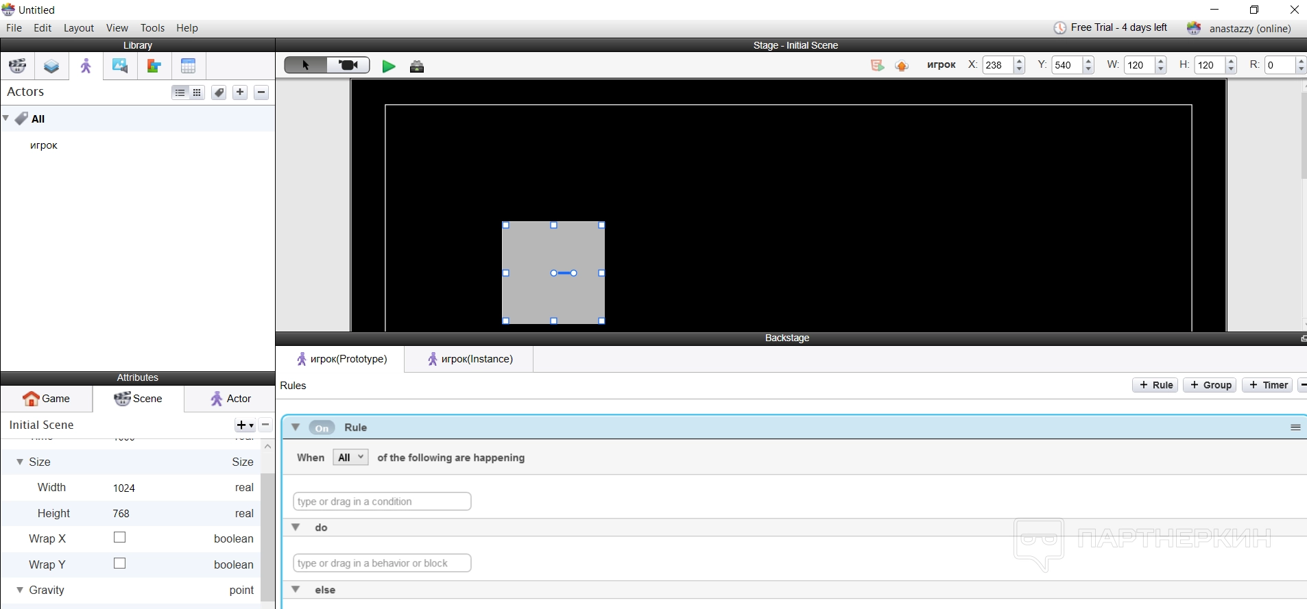 По такой логике происходит все построение игры — пользователь создает сцену и актеров, добавляет собственные ассеты для оформления игры и ее сопровождения, а потом использует правила и условия, чтобы анимировать персонажей или предметы.