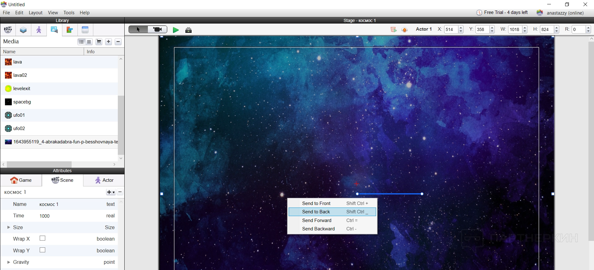 В процессе важно подогнать размер фона под сцену — для этого можно использовать настройки в правом верхнем углу. Но также важно расположить изображение фоном, чтобы оно не перекрывало действующих персонажей. Чтобы это исправить, нужно нажать на правую кнопку мыши и выбрать функцию «Переместить назад».