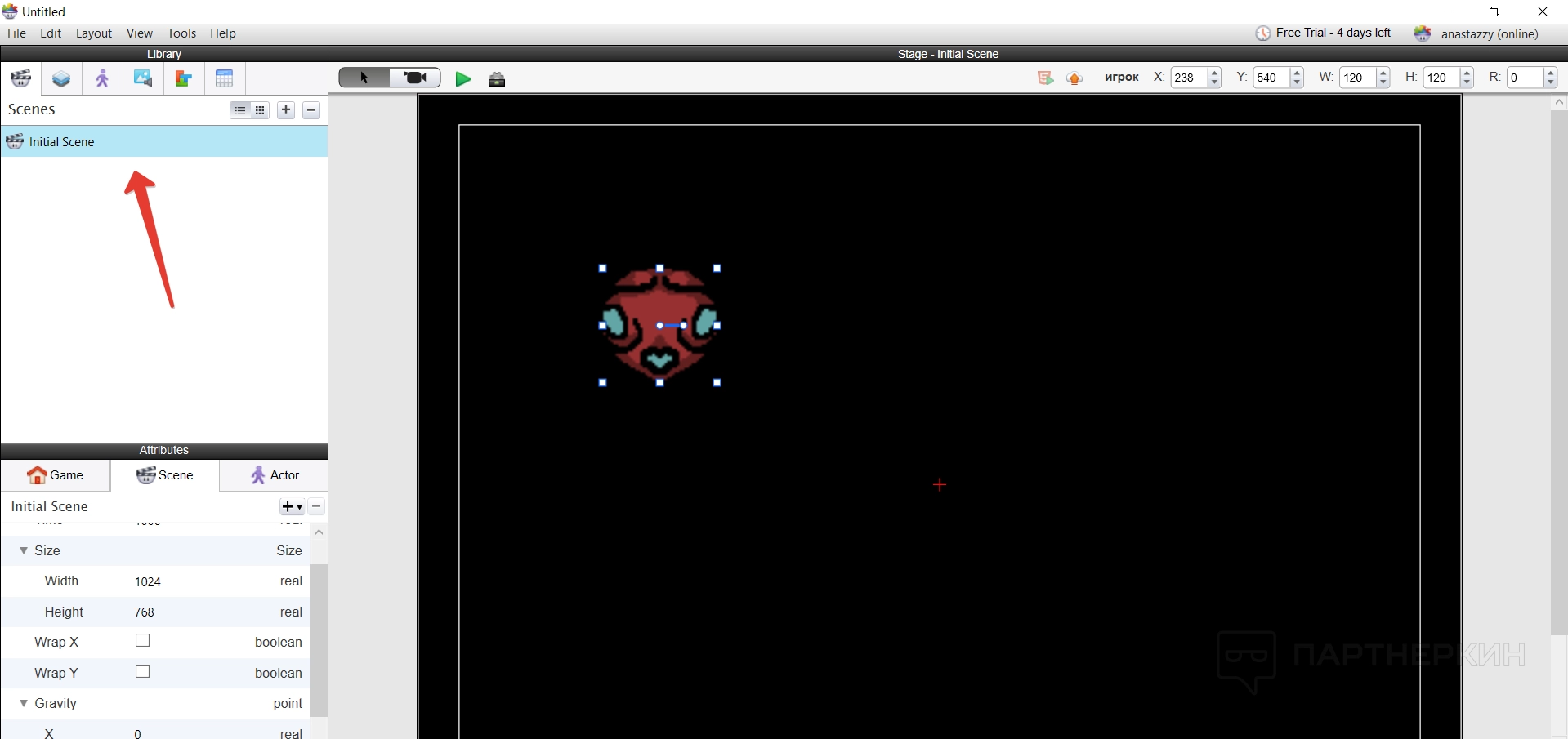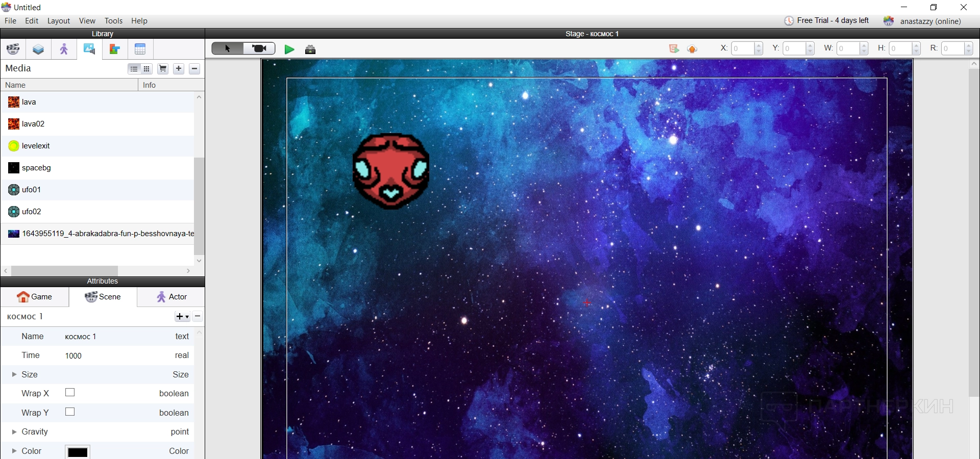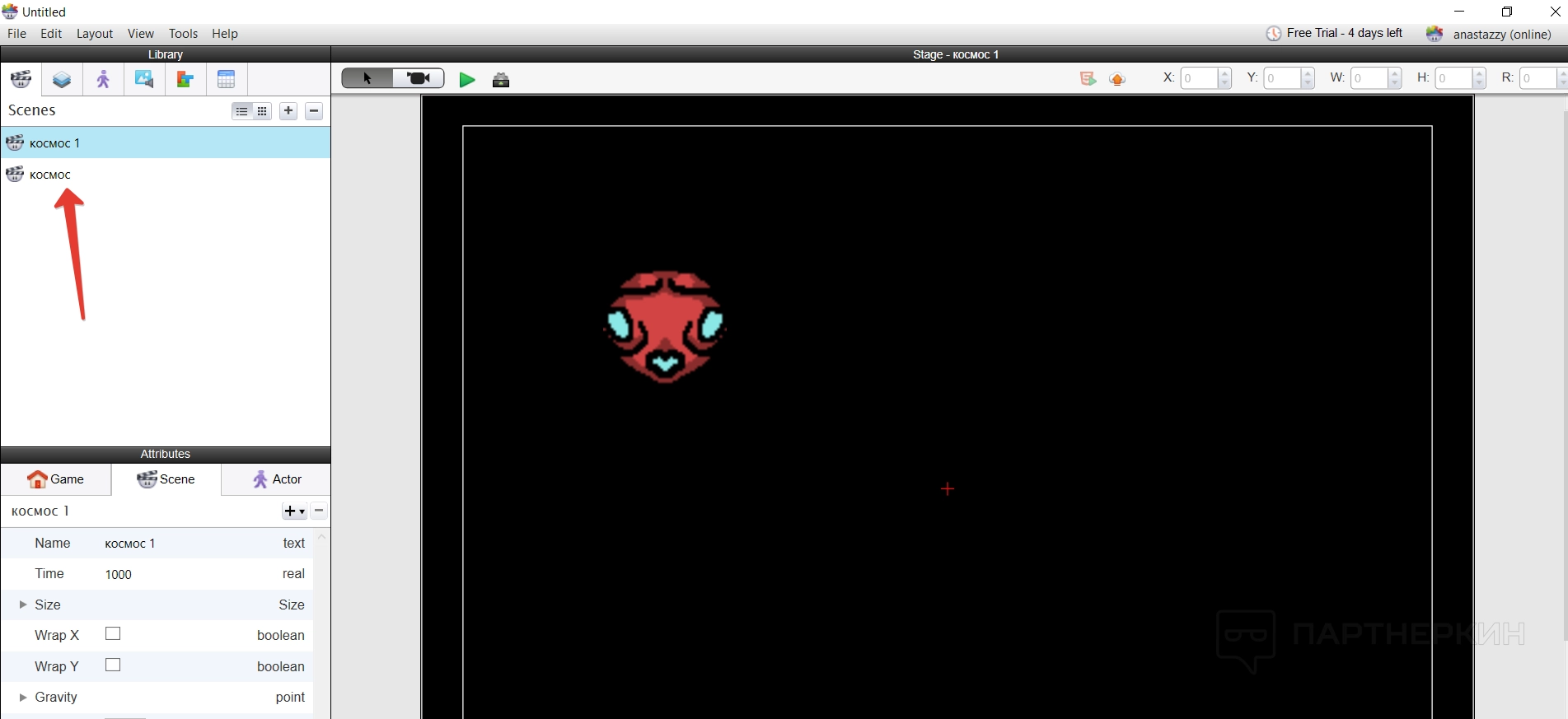Сцена создается по умолчанию при старте любого проекта. При этом можно создавать дополнительные сцены, ведь персонажи не будут вечно находится только на одном фоне. Например, создать окружение космоса и какой-то конкретной планеты.