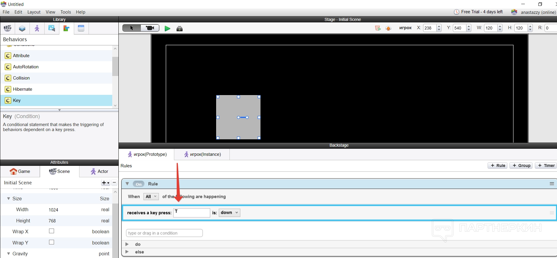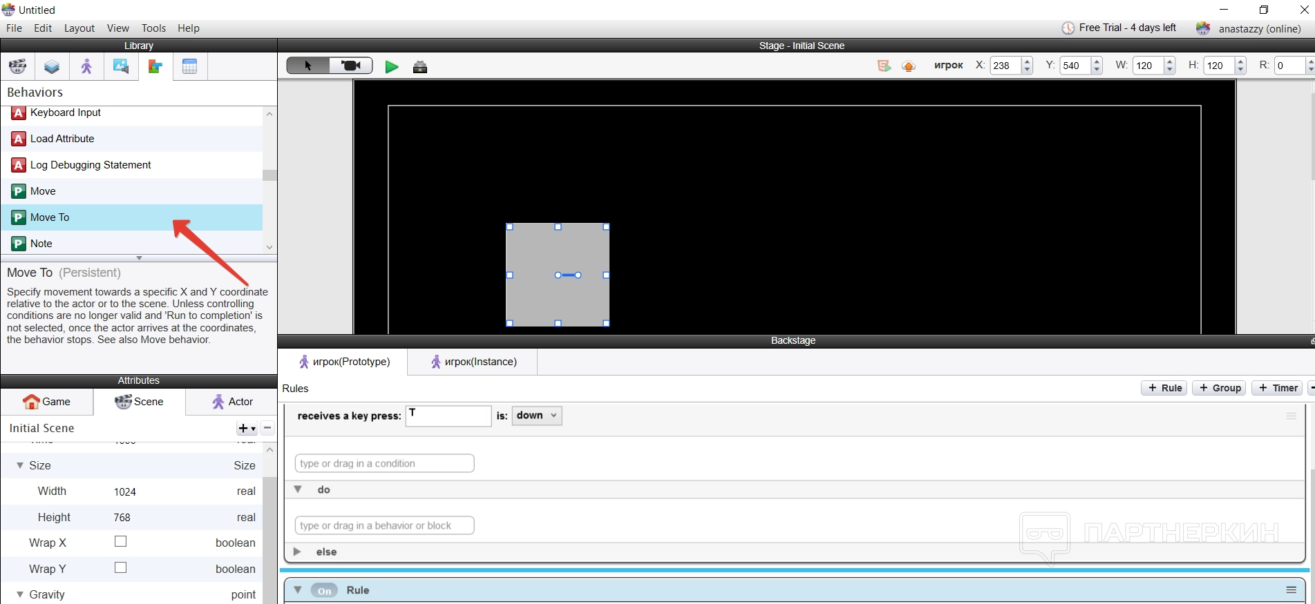 После этого нужно указать, что актер будет делать в случае нажатия на эту клавишу. Для этого нужно открыть папку с Behaviors и выбрать нужное движение — мы выбрали движение.