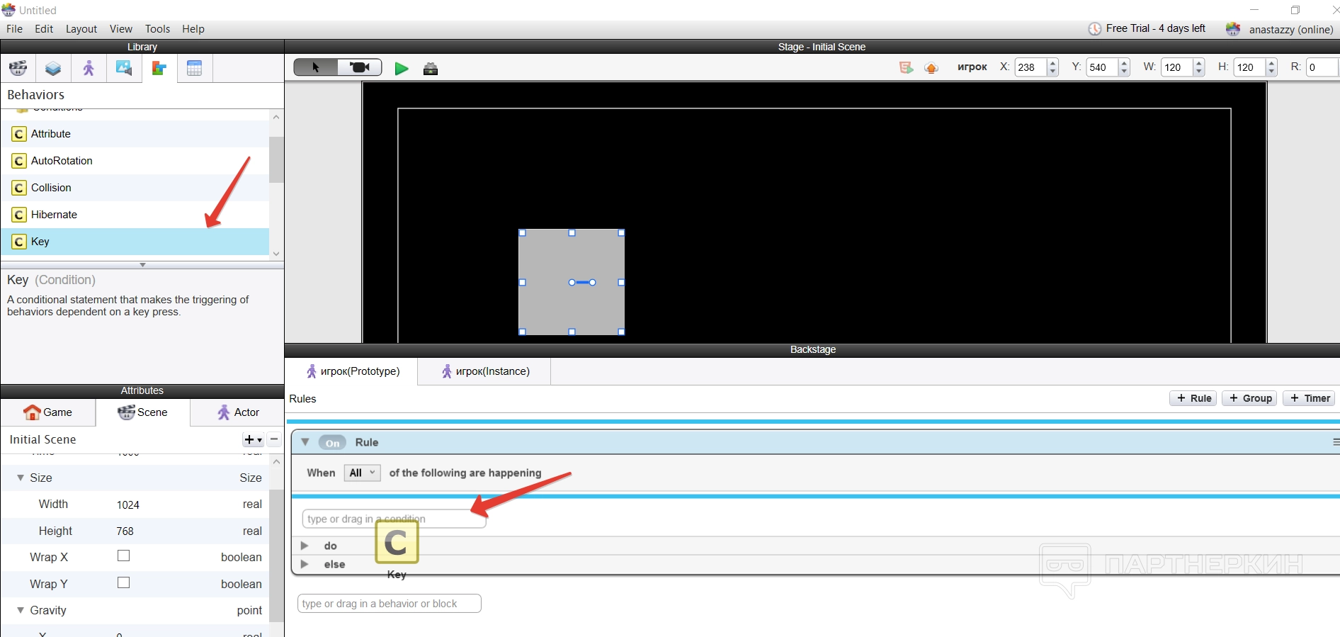 Можно выбрать любое условие, но мы выбрали «Key», то есть клавишу, и переместили строку с условием в пустое поле.