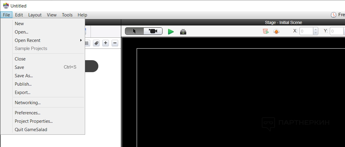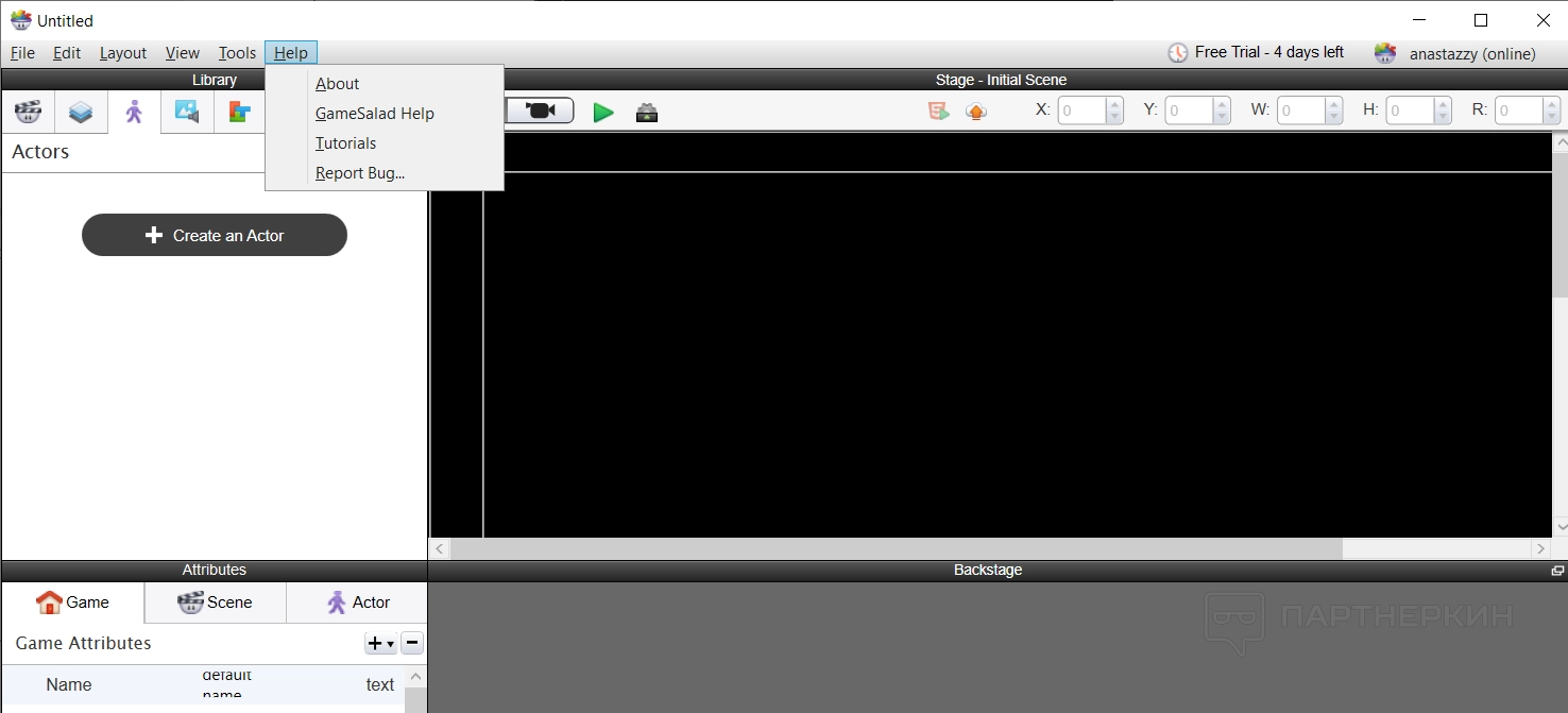 - GameSalad help — пункт переводит в базу знаний GameSalad, чтобы найти ответы на популярные вопросы или почитать инструкции;