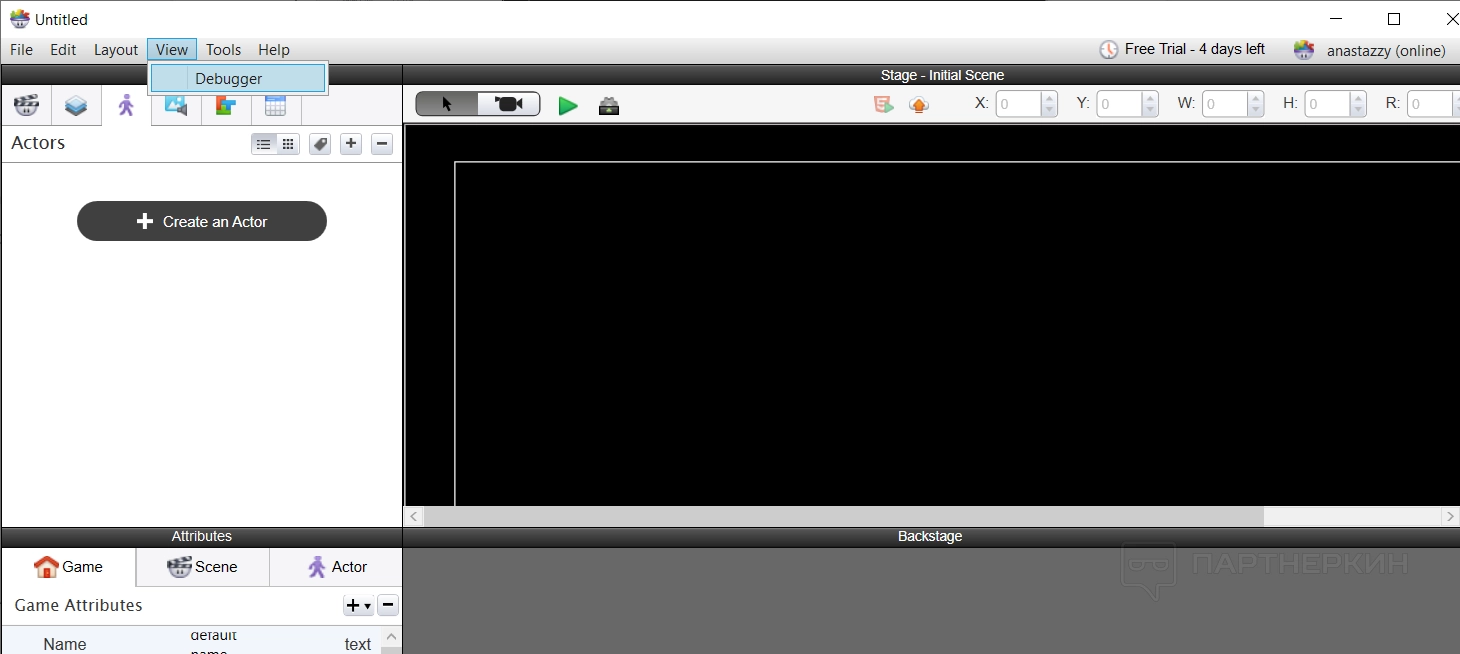 View — в этом разделе можно открыть только один пункт, и это дебаггер, который является отладчиком — он дает возможность следить за всеми ошибками при составлении игры.