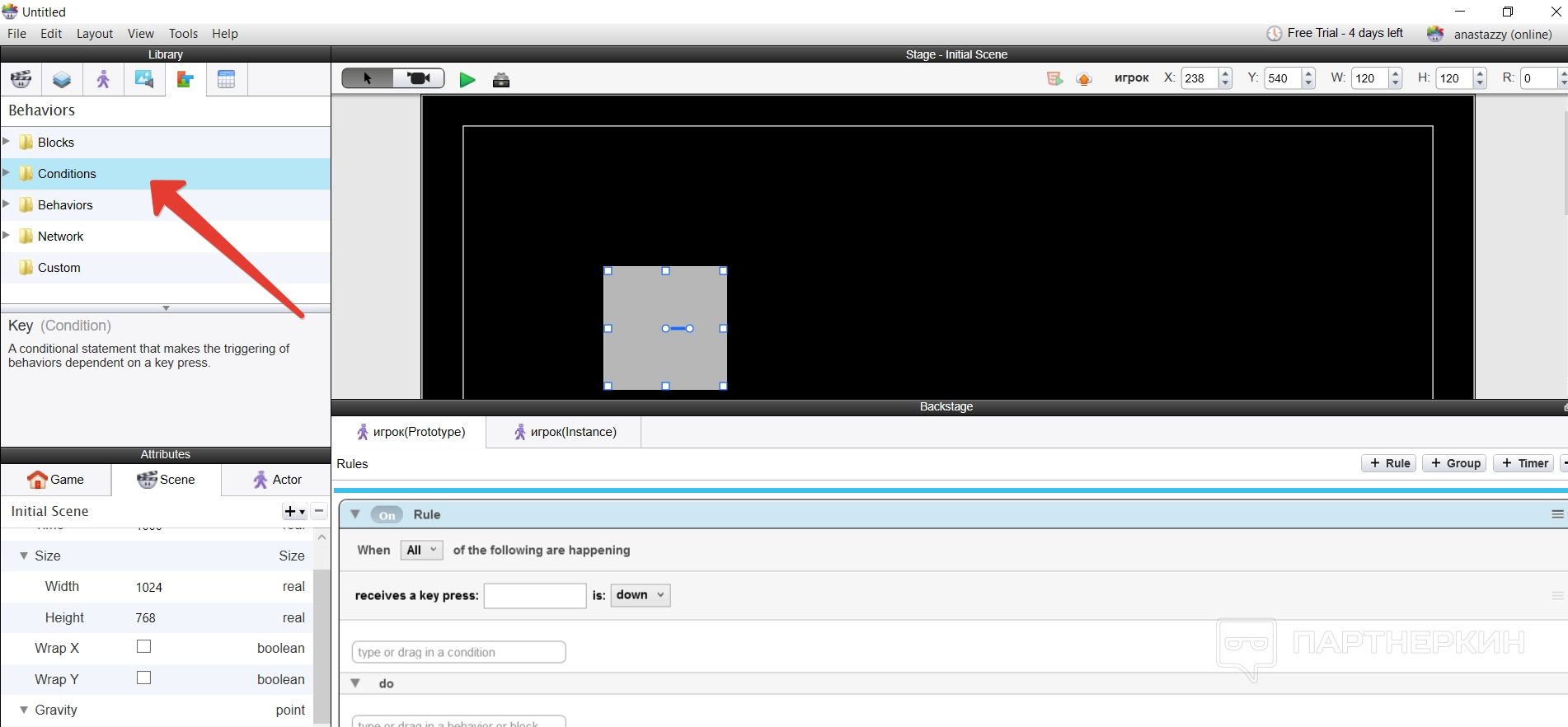 Чтобы добавить любое условие и действие, нужно сначала определиться с типом условия. Скажем, нам нужно, чтобы при нажатии клавиши «T» на клавиатуре, актер начинал двигаться. Тогда нужно в разделе «Behaviors» открыть пункт с «Conditions», то есть условия.