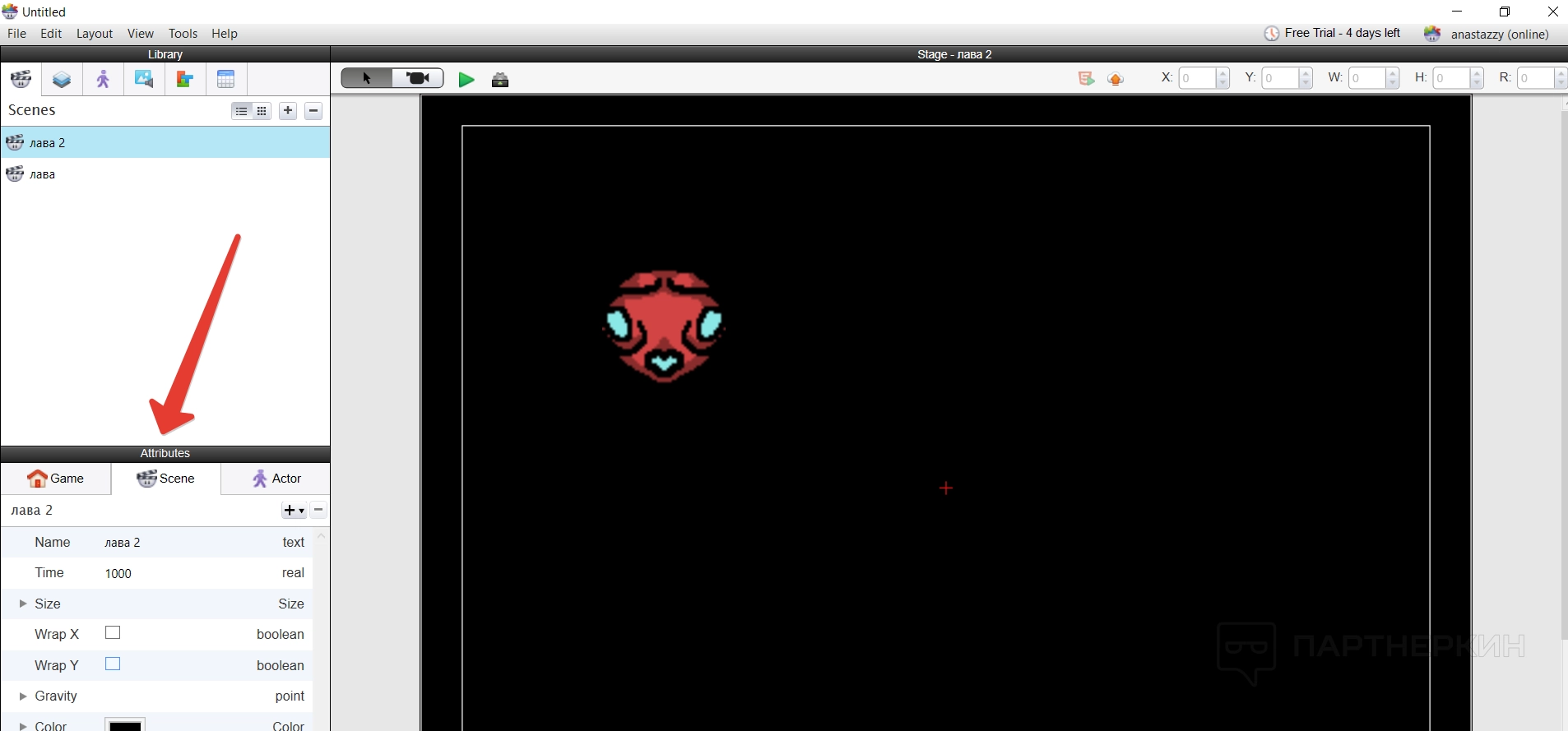 Для этого просто нажимают плюсы, меняют название сцены и дополнительно по необходимости ее настраивают через раздел с атрибутами. Там можно настроить разрешение сцены, цвет и так далее — подробнее об этом разделе поговорим позже.