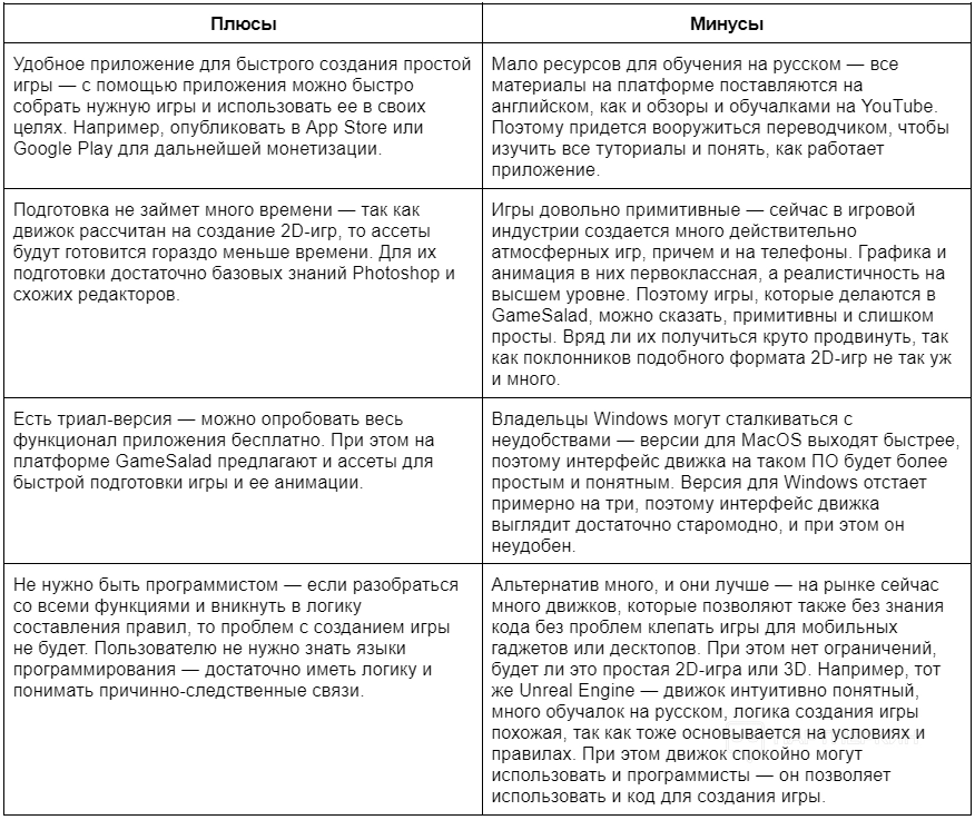 Плюсы и минусы приложения GameSalad