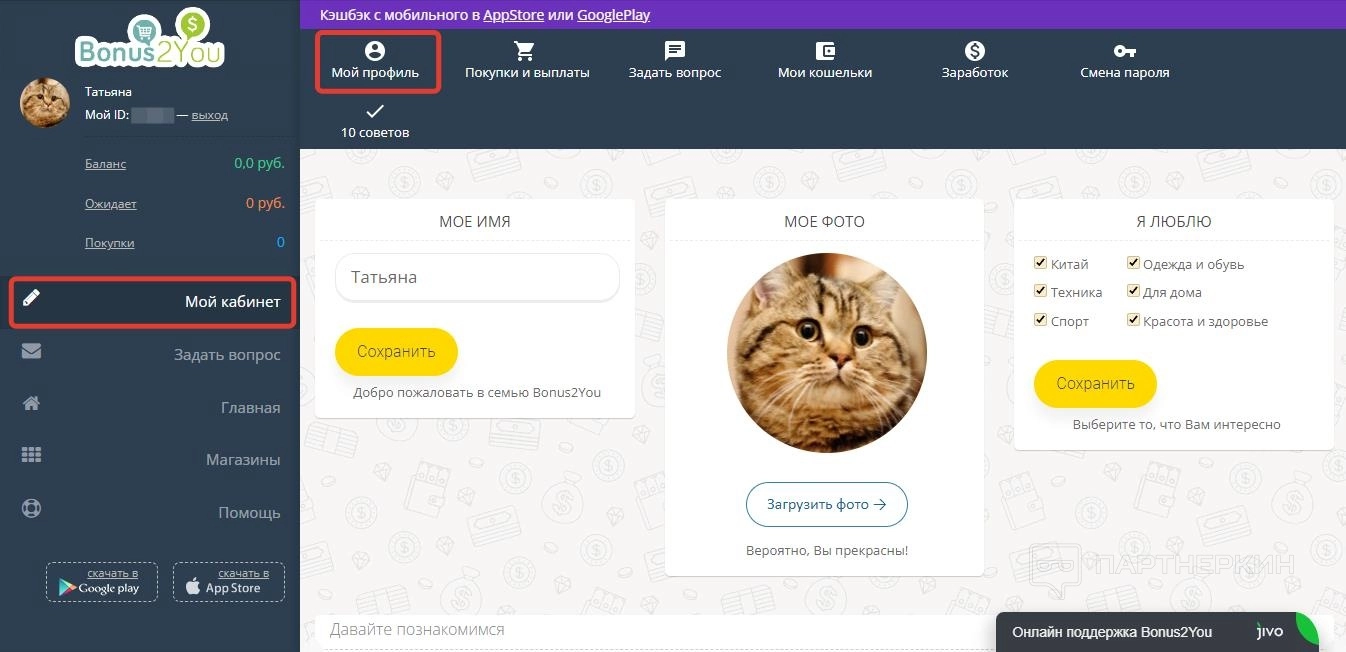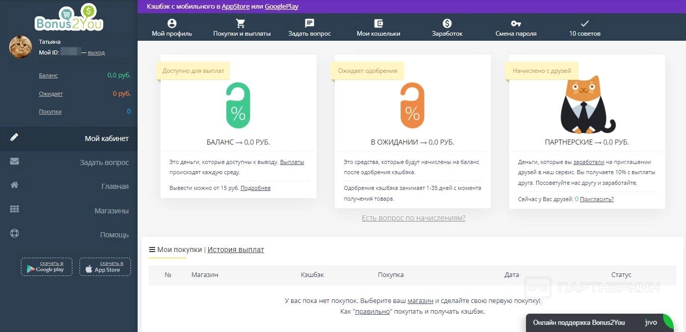 Подтверждения почты не требуется – сразу после заполнения регистрационной формы становятся доступны все функции сервиса. В боковой колонке появляется краткая информация о балансе: зачисленные бонусы, ожидающие начисления баллы и завершенные покупки.