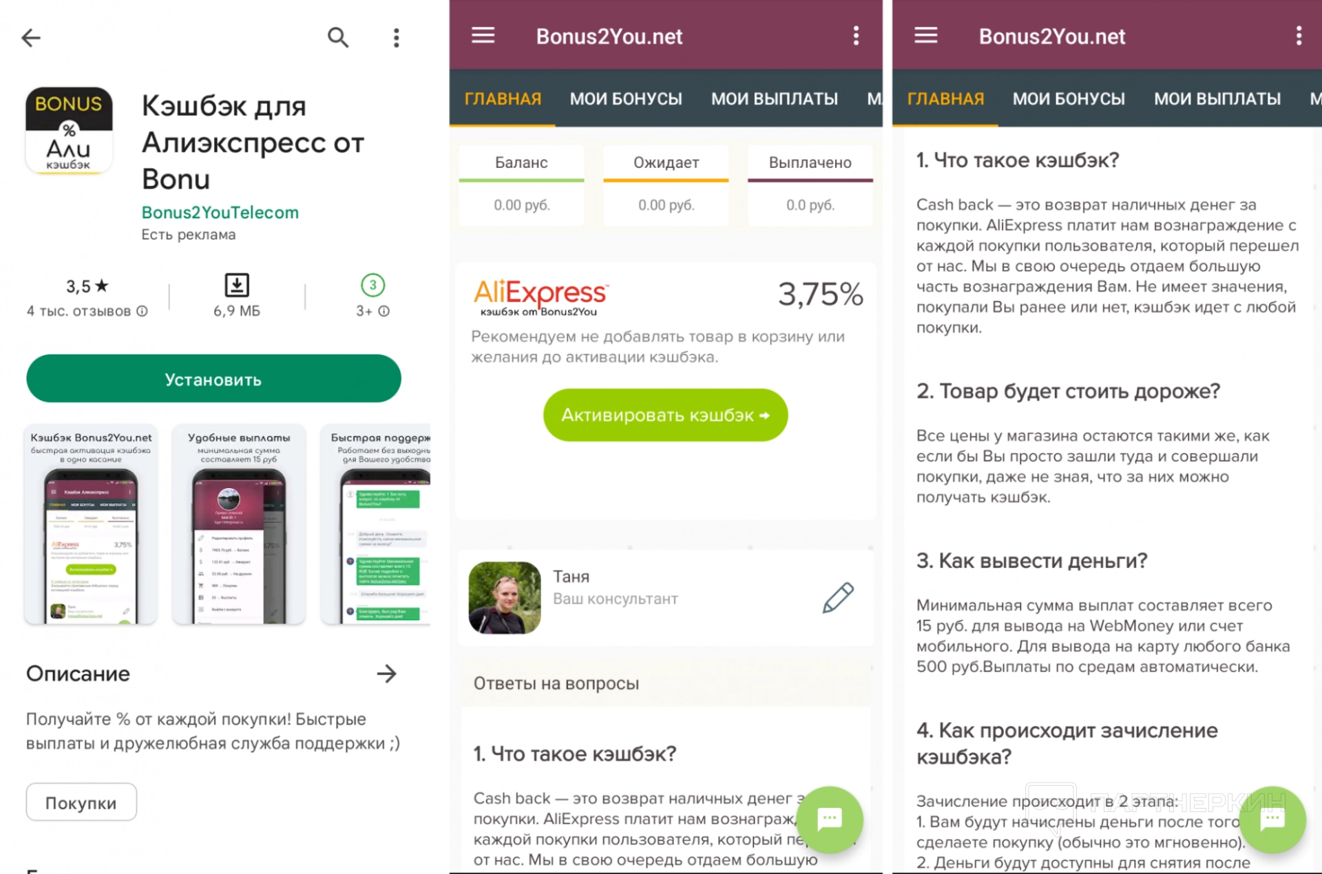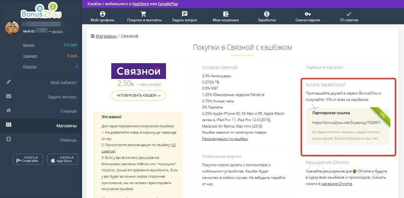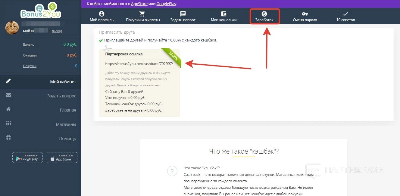Отчисления по партнерской системе составляют 10% от каждого полученного рефералом кешбэка. Участники реферальной программы могут отслеживать данные о привлеченных пользователях и реферальных отчислениях в разделе «Покупки и выплаты» и в разделе « Заработок»..