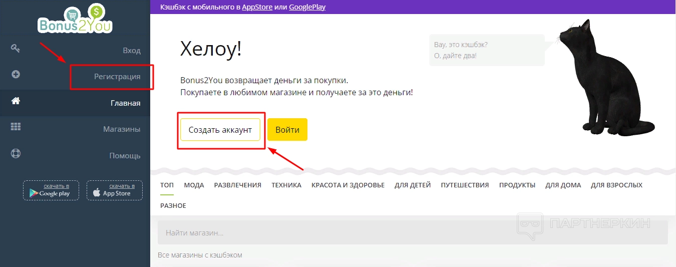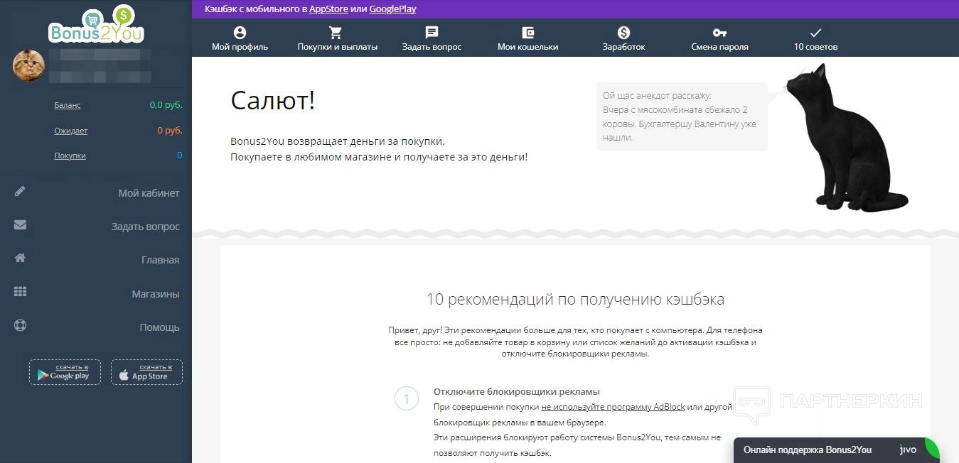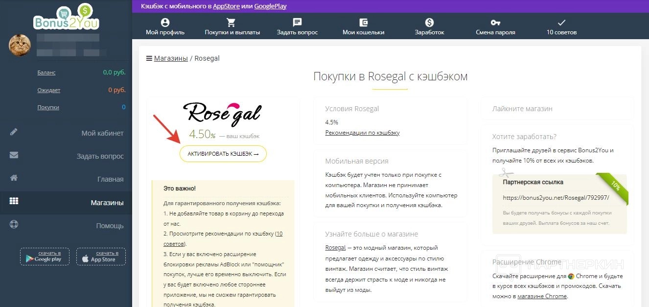- Магазины – список доступных на платформе сайтов с кешбэком;