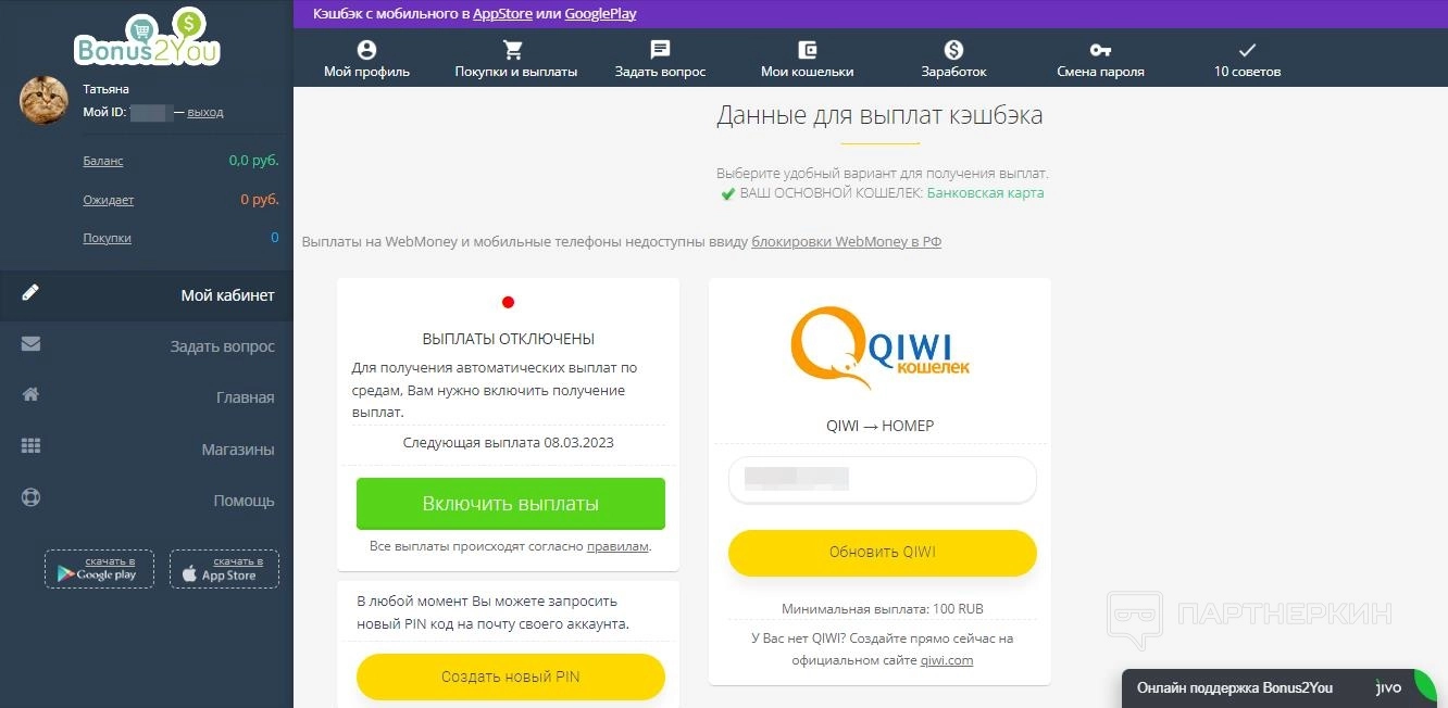 - Мои кошельки – добавление платежных данных для вывода денежных бонусов;