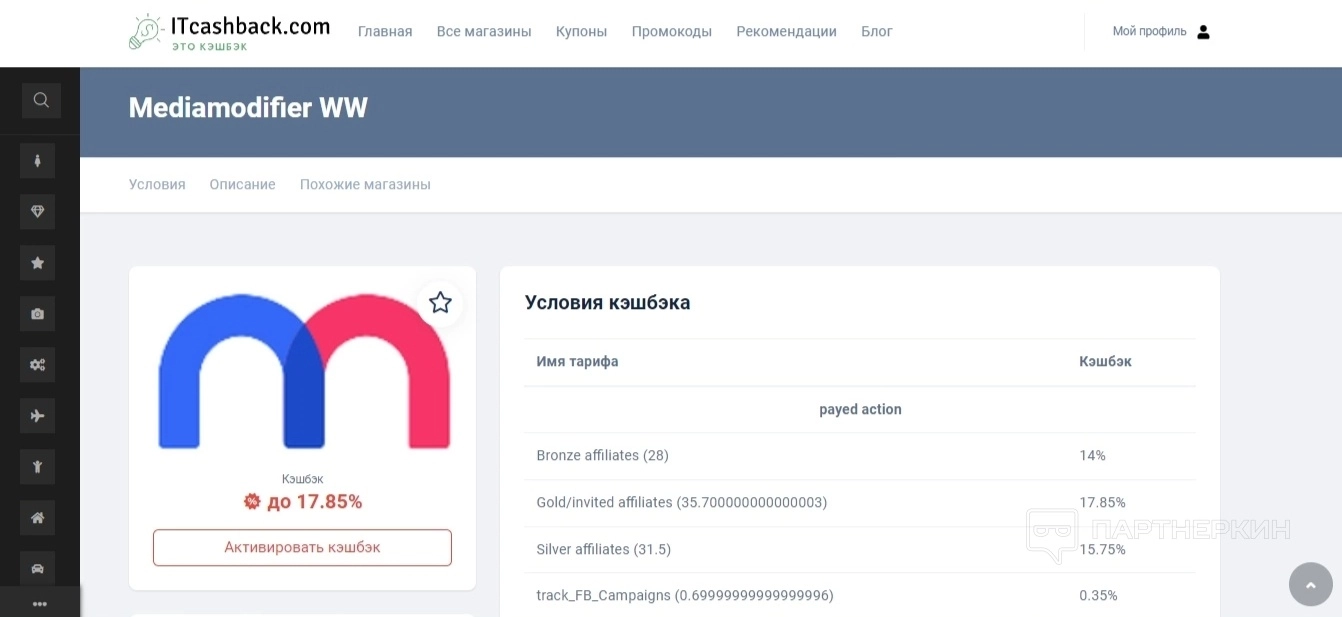 Первым делом находим нужный магазин и заходим в его карточку. Здесь представлены все условия по возврату кешбэка, а именно его базовая ставка и размеры для других уровней (больше пользуешься сервисом — выше статус и выше кешбэк).