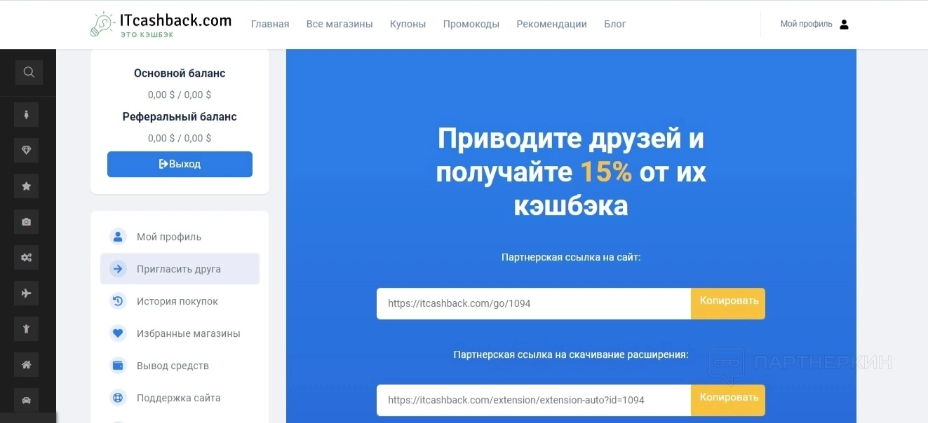Следующий раздел отвечает за реферальную программу . Здесь находятся две ссылки, на которых пользователь сможет зарабатывать, приглашая своих друзей — ссылка на сам сервис и его расширение для браузера.
