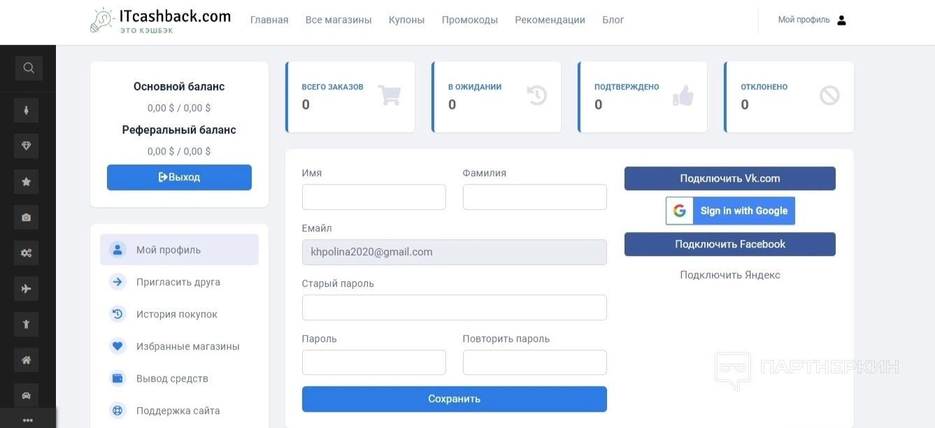 Здесь доступна вся информация о балансе счета и статусе других операций, а также данные для редактирования (имя, пароль и так далее). Можно дополнительно подключить свои социальные сети.