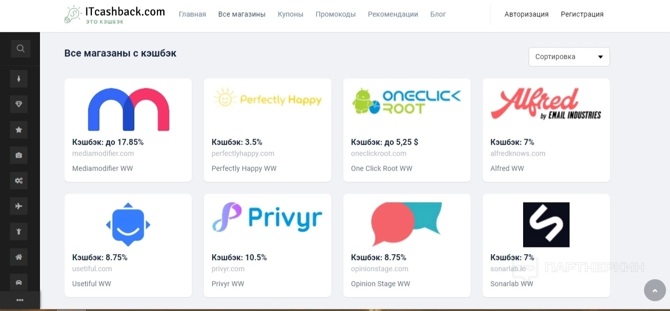 На главной странице сайта можно заранее ознакомиться с полным списком и доступными категориями магазинов, совершая покупки в которых пользователь может рассчитывать на возврат части потраченных средств.