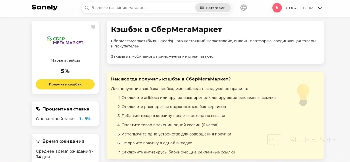 После того, как пользователь перейдет в онлайн-магазин, сбоку появится специальный значок, символизирующий активацию кешбэка. Далее можно совершать заказ и отслеживать статус начисления кешбэка. В среднем срок обработки заказа составляет от 30 дней.