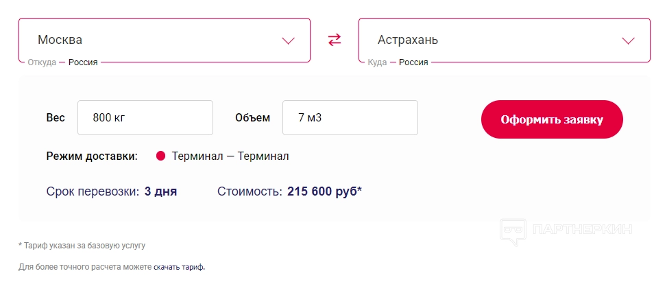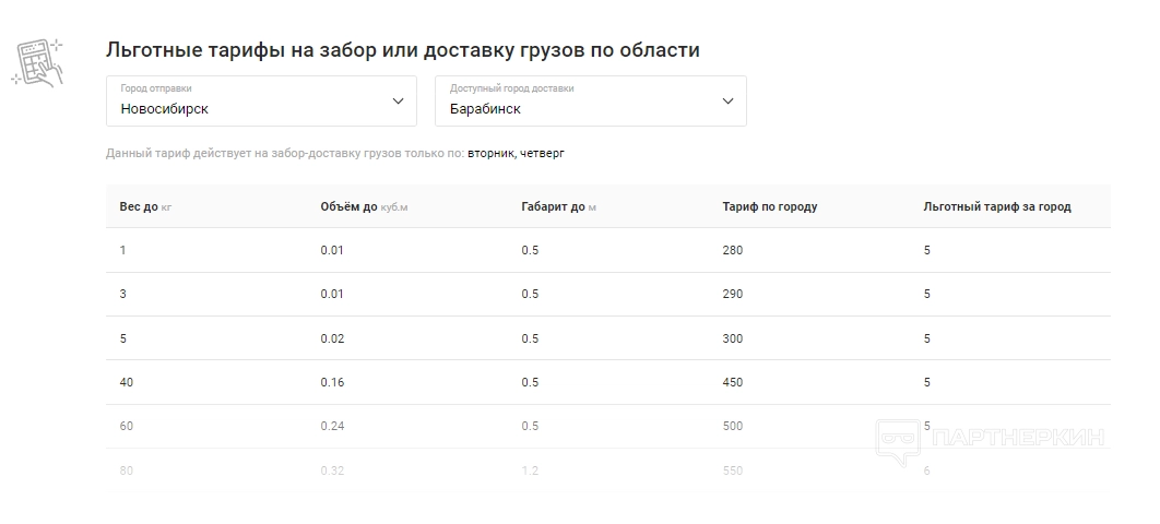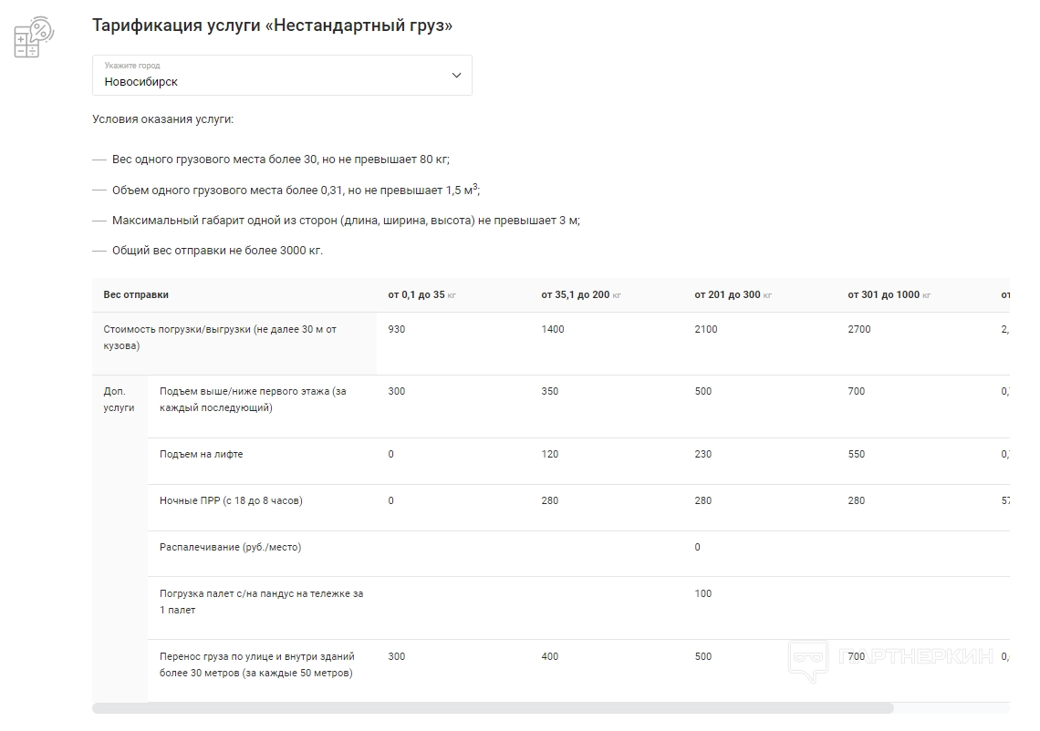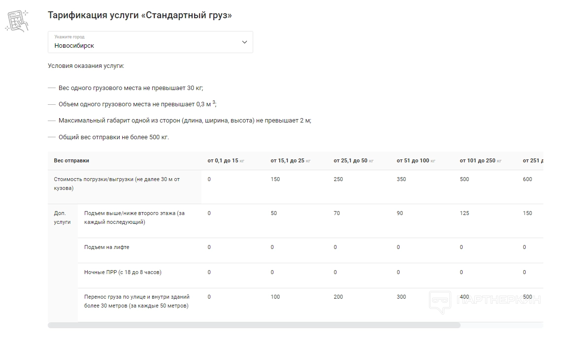 Клиенты могут воспользоваться этим сервисом только при оформлении услуг «Забор и доставка груза». Тарификация услуги «Стандартный груз» выглядит так: