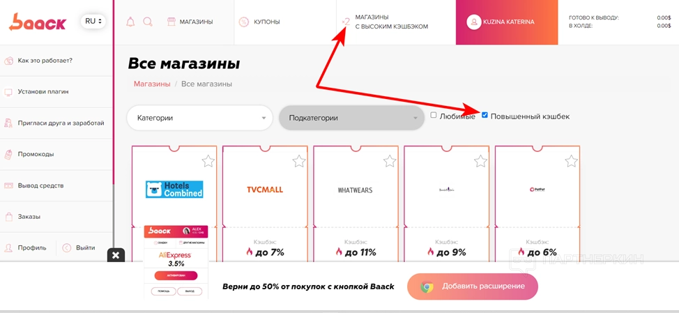Выбрать маркетплейсы с высоким кэшбэком можно двумя способами. Через вкладку в верхнем меню. Также в разделе «Магазины» есть опция «Повышенный кэшбэк». Поставьте напротив галочку, чтобы высветились все необходимые платформы.