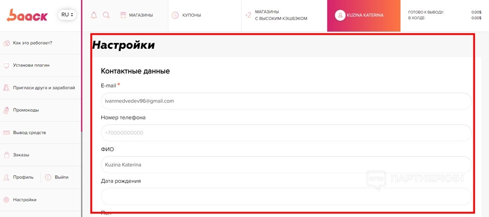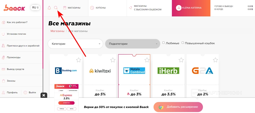 В верхнем меню открывается доступ ко всем маркетплейсам. Также там есть переход к купонам и магазинам с высоким кэшбэком. В самом верхнем правом углу находятся два счета — основной и временно замороженный. О них будет сказано чуть позже.