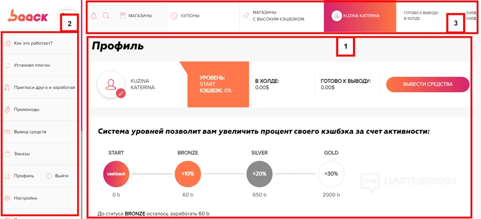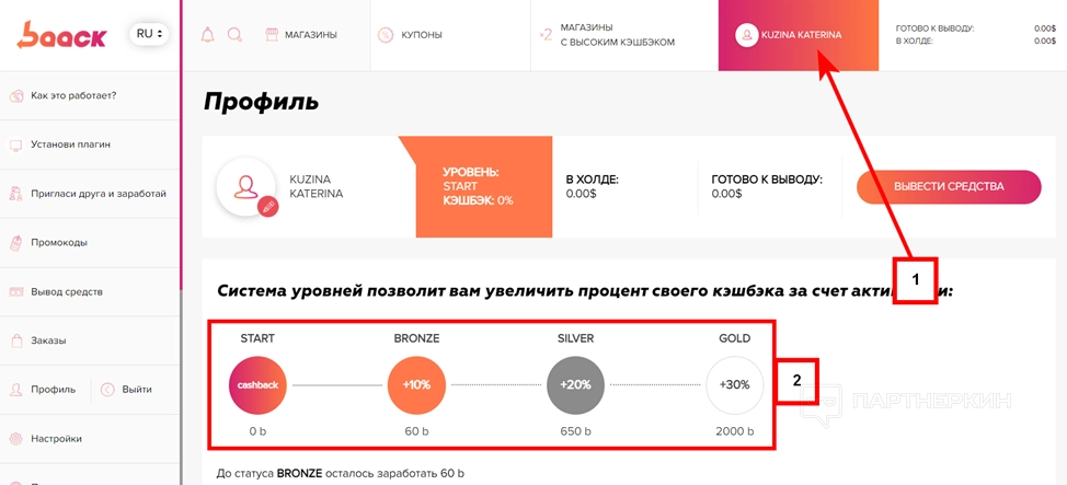 Чем больше покупок пользователь будет совершать, тем выше у него будет статус. Кэшбэк также увеличится. Посмотреть свой уровень можно через профиль (1) и в разделе системы уровней (2).