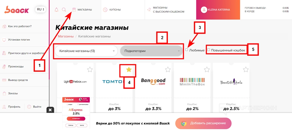 Все предложения находятся в разделе «Магазины» (1). Выбрать подходящий раздел можно через категории (2). Если магазин добавлен в категорию «Любимые» (3), иконка маркетплейса подсвечивается желтой звездочкой (4). Также можно отметить все магазины с повышенным кэшбэком (5).