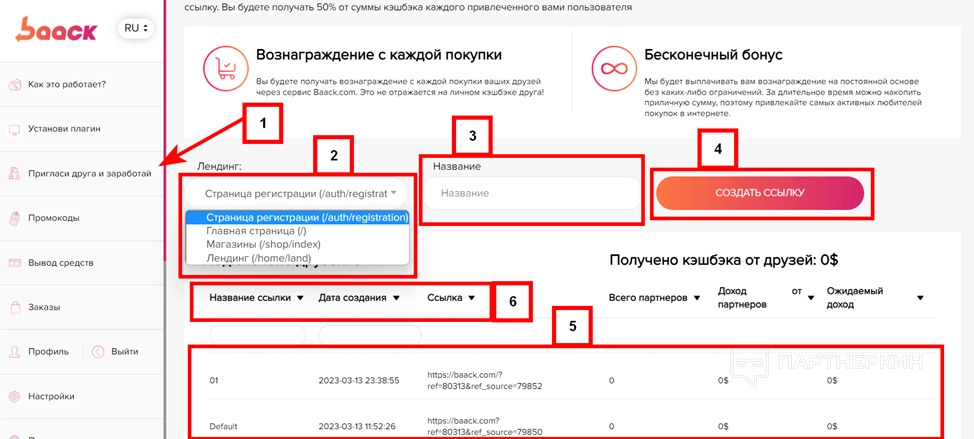 - Нажмите на вкладку «Пригласи друга и заработай» (1).
