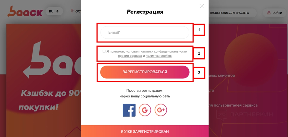 - Укажите свой Email (1). Поставьте галочку напротив «Я принимаю условия политики конфиденциальности правил сервиса и политики cookies» (2). Затем выберите «Зарегистрироваться (3).