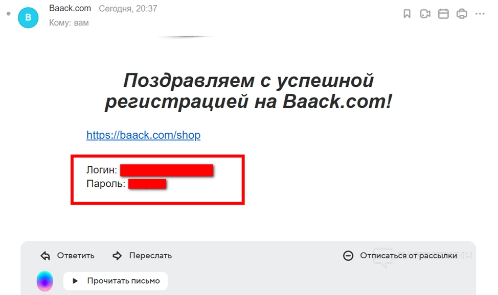 - На почту придет письмо с логином и паролем. Их можно использовать для входа на кэшбэк-сервис.