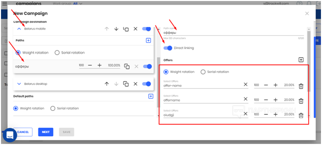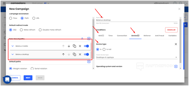 Найдём наиболее конвертящие предложения и настроим на них ротацию распределения трафика по самым выгодным связкам. Для каждого гео необходимо определить два пути со своими правилами. Например, для Беларуси это выглядит следующим образом. Гео будет одинаковым — «Belarus». Тип устройства же для каждого пути будет разный — трафик из Беларуси с мобильных устройств попадёт на группу офферов 1, а трафик из Беларуси с десктопов и ноутбуков попадёт в ветке на группу офферов 2. Всегда задавайте «Name» для пути, чтобы просматривать статистику в разделе репортов было максимально удобно.