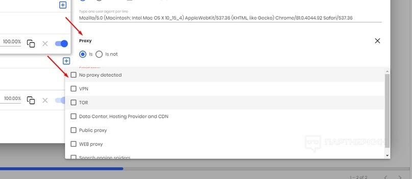 1. Блокировка по дата-центрам/прокси трафику (по базам ip2location). Можно легко перенаправить нежелательный трафик, обозначив его в настройках кампании или указать полный юзерагент из раздела «Conversions» трекера либо его часть. Например, Mozilla/5.0 (Macintosh; Intel Mac OS X 10_15_4) AppleWebKit/537.36 (KHTML, like Gecko) Chrome/81.0.4044.92 Safari/537.36 или AppleWebKit/537.36 (KHTML, like Gecko) Chrome/81.0.4044.92 Safari/537.36.