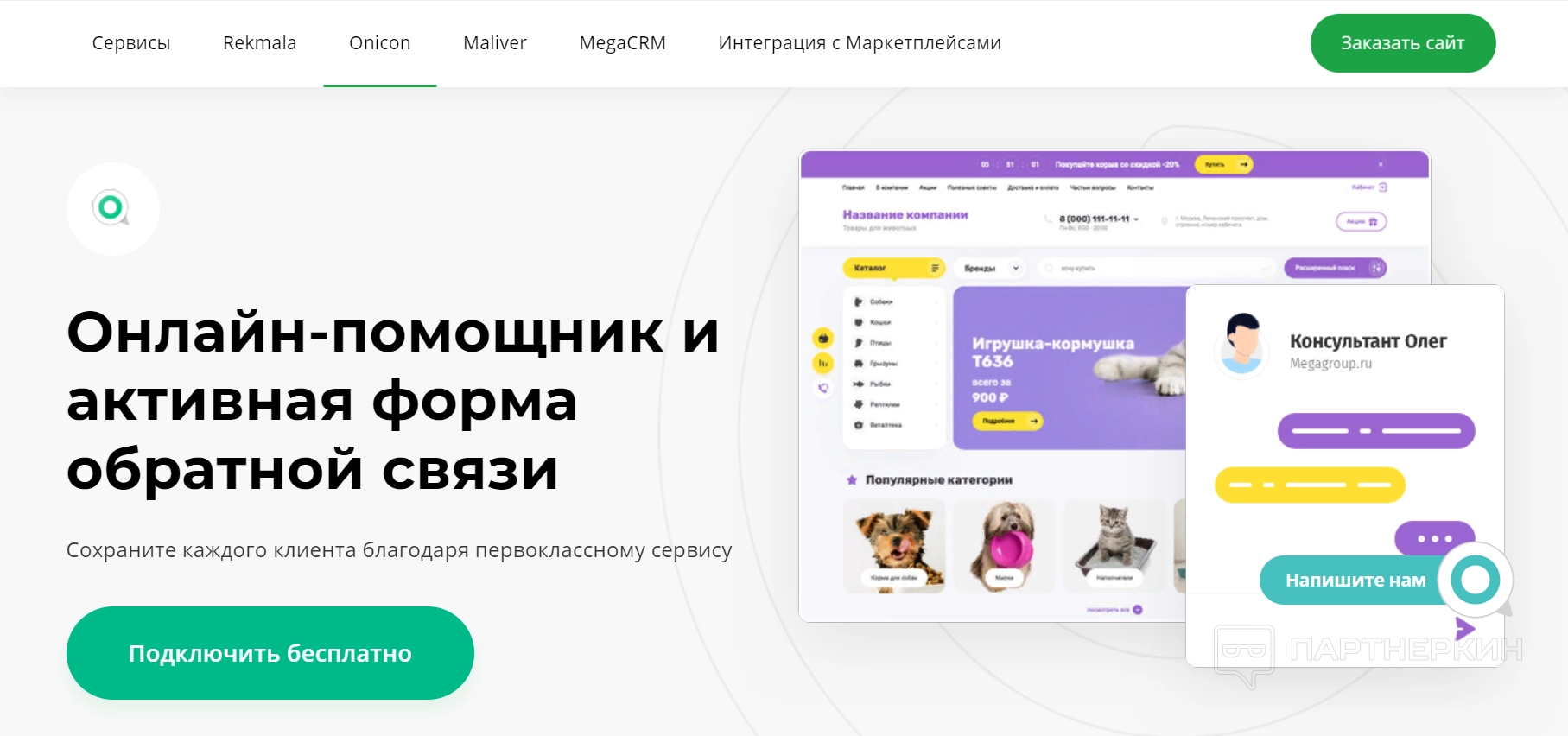 1. Перейти на официальный сайт проекта (Onicon) и нажать на кнопку «Подключить бесплатно». Между делом можно рассмотреть содержимое веб-страниц: чем занимается MegaGroup, какие еще сервисы можно взять в работу, и насколько полным может стать виртуальный помощник, если все их интегрировать.
