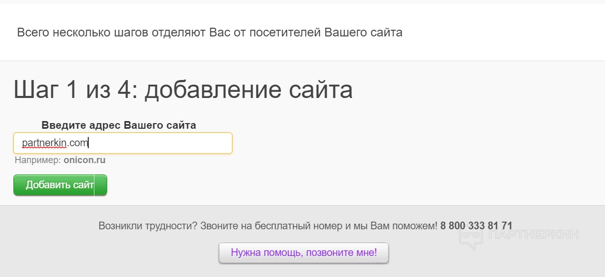 4. Но от мошеннического в этом ничего нет — нажав на кнопку «Войти», пользователь попадает в рабочую панель. И первым же шагом предлагается ввести адрес сайта в общем формате. Если возникают проблемы, можно обратиться в техническую поддержку по номеру телефона (номер бесплатный) или посредством виджета.
