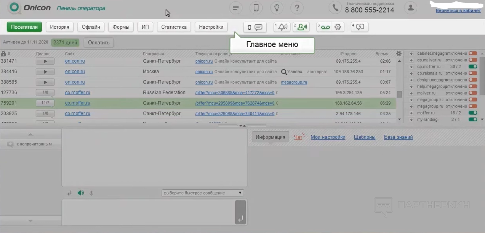 Сверху располагается главное меню с основным функционалом сервиса. С помощью вкладок можно переключаться между базами данных «Посетители», «История», «Офлайн» (автоматически обработанные заявки), «Формы», «ИП», «Статистика» и просмотреть настройки. Также внутри основной панели есть несколько счетчиков: