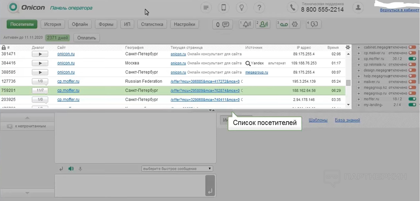В первую очередь оператор видит список посетителей на сайте. При этом можно производить сортировку по номеру заявки, активности диалога, сайт-источник и геолокации. Дополнительно можно изучить, на какой именно странице сейчас находится пользователь, откуда он пришел, в какое время и с какого IP-адреса.