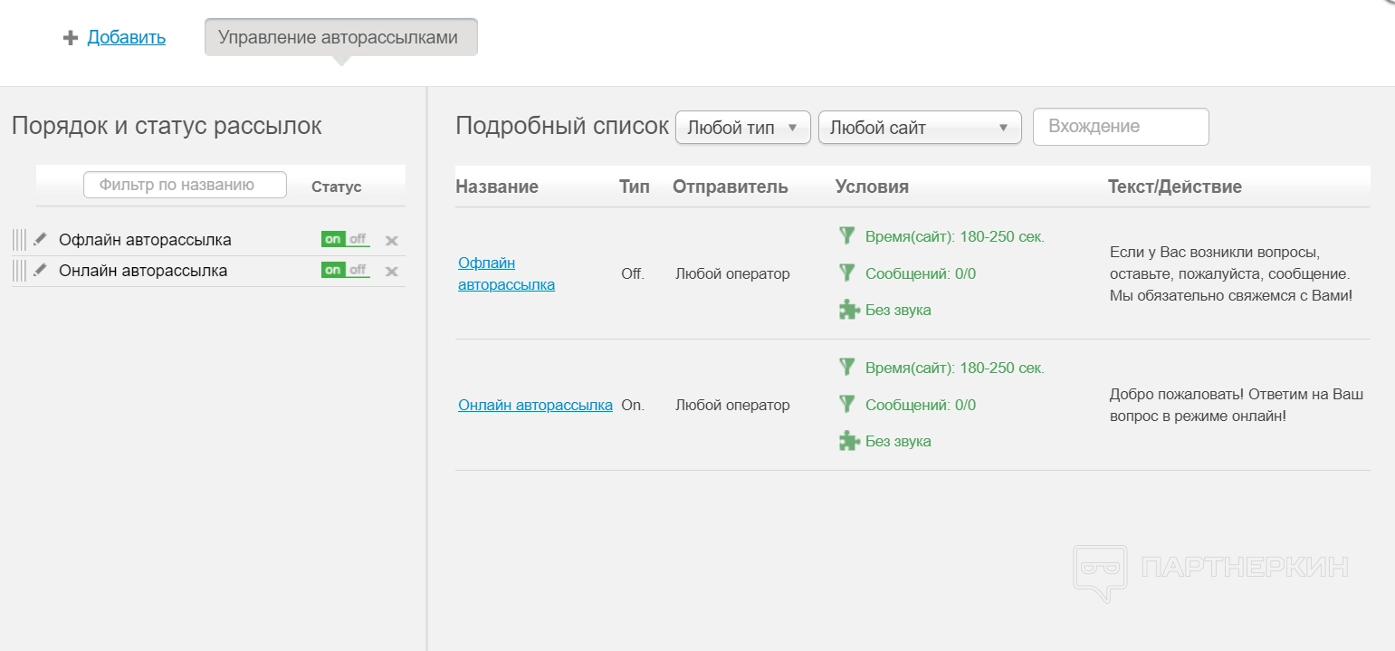 Кстати, говоря о приветственных сообщениях — это отдельное окошко, представляющее из себя набор шаблонов. Их можно разграничивать на онлайн и оффлайн-ответы в зависимости от того, есть ли кто-то из операторов в сети.