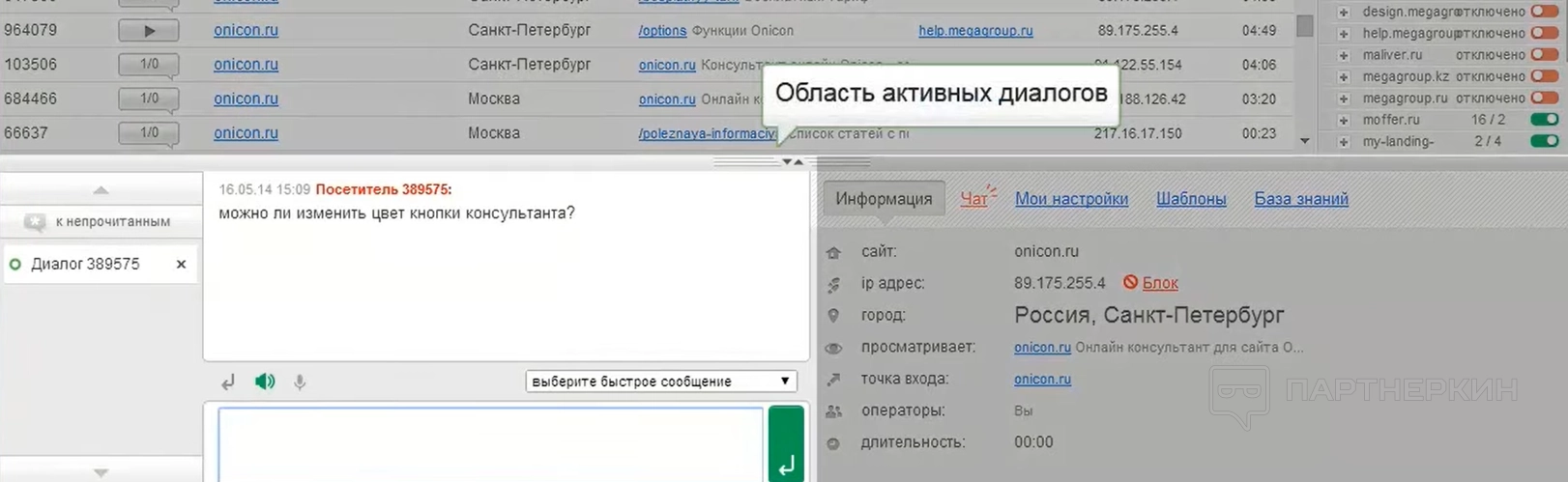 Как только оператор открывает диалог по вызову, перед ним появляется область активных диалогов и основная информация по пользователю. При этом администратор может просматривать, как именно реагируют его коллеги, просматривая чужие разговоры. Иногда это помогает в решении ряда проблем — например, если ответ неизвестен, но другой оператор мог уже сталкиваться с этим вопросом.