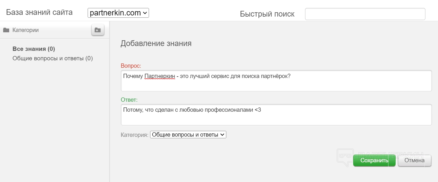 База знаний — не менее важный элемент всей системы, — формируется посредством добавления вопросов и ответов на них. Если пользователь захочет открыть «Наиболее часто задаваемые вопросы», либо введет полностью идентичный запрос в поле запроса, он получит соответствующий ответ и категорию.