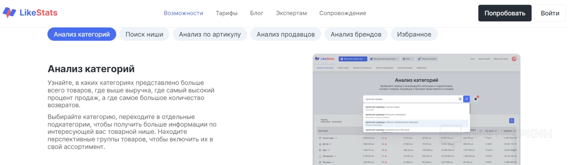 - анализ категорий — пользователи могут просматривать подробную аналитику по выбранным категориям товаров. Можно узнать такие данные, как динамика, товары категории, подкатегории, бренды продавцы и так далее;