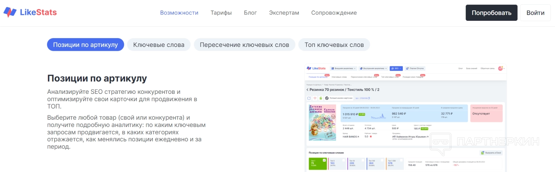 Seo — данный инструмент позволяет пользователя посмотреть позиции по конкретному артикулу, проанализировать все необходимые ключевые слова, проследить пересечение ключевых слов с другими магазинами или продавцами, узнать топ ключевых слов.