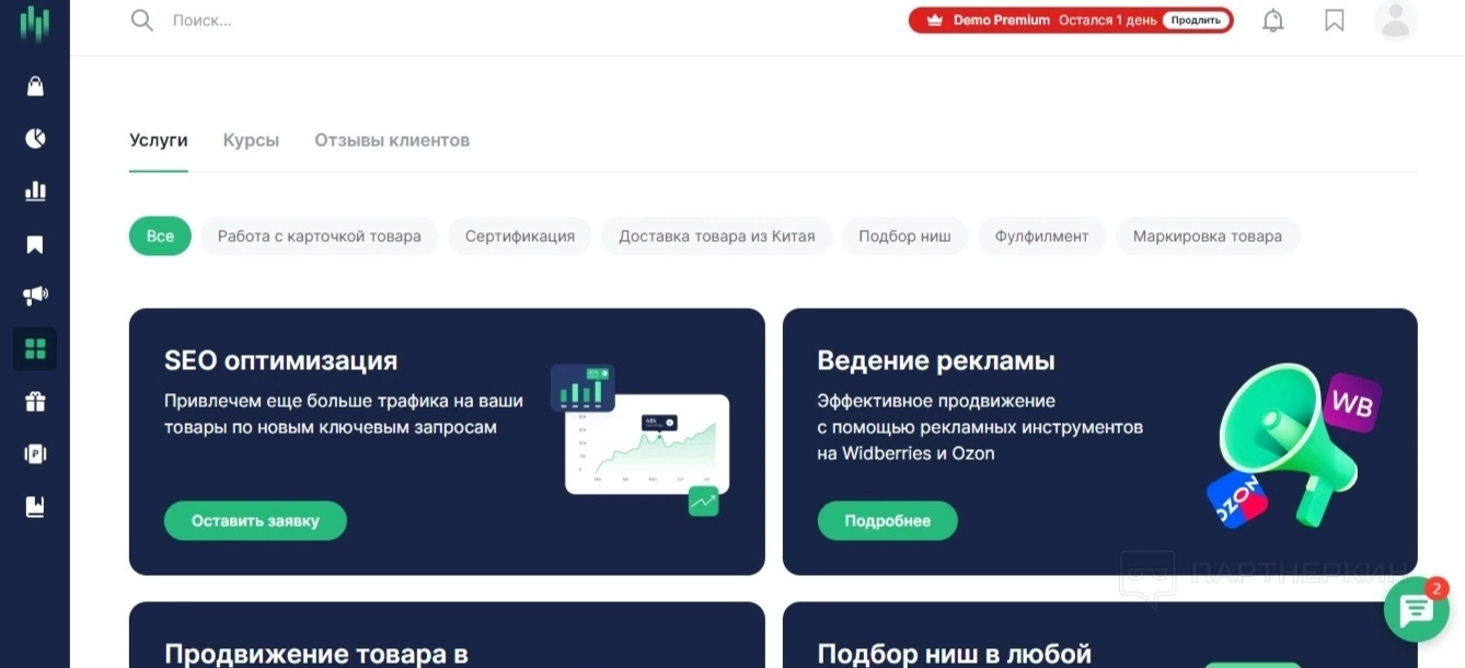 В Услугах собраны все доступные на данный момент предложения за отдельную стоимость, способствующие продвижению магазина и бизнеса в целом. Также именно здесь можно записаться на курсы и почитать отзывы клиентов, кто уже заказывал дополнительные услуги.
