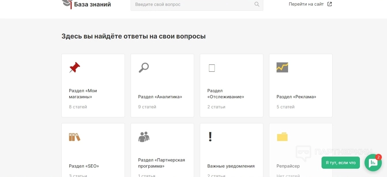 Раздел База знаний перенаправляет пользователя в отдельное окно, где тот может почитать дополнительные материалы по работе с конкретными разделами.