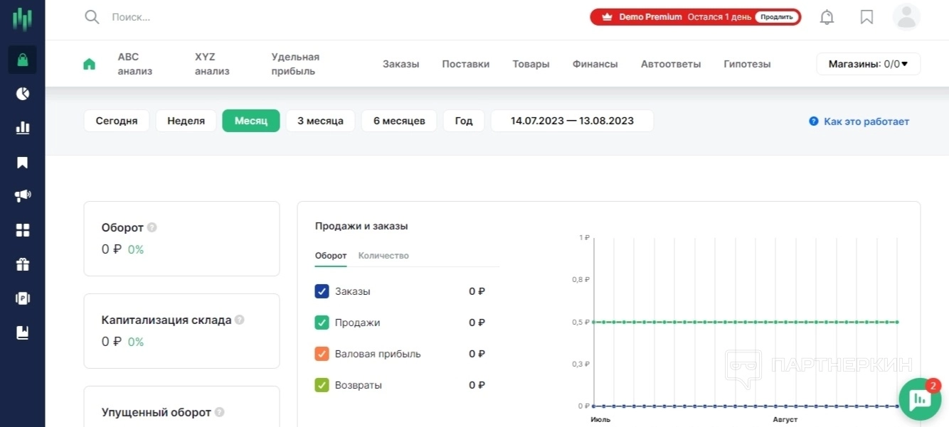 После прохождения авторизации пользователь попадает главный раздел — Мои магазины. Здесь собрана краткая статистика магазинов за определенный период (можно выбрать из предложенных или самому настроить даты), а также доступ к таким инструментам как ABC-анализ, удельная прибыль, заказы и поставки, товары и так далее.