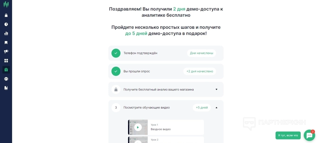 Стоит отметить важный момент! После регистрации пользователю дается возможность продлить бесплатный тестовый период использования сервиса сроком до 7 дней. Для этого необходимо совершить некоторые действия: пройти опрос и посмотреть видеоуроки. За прохождение опроса начисляется 2 дня, за просмотр видео — еще 5.