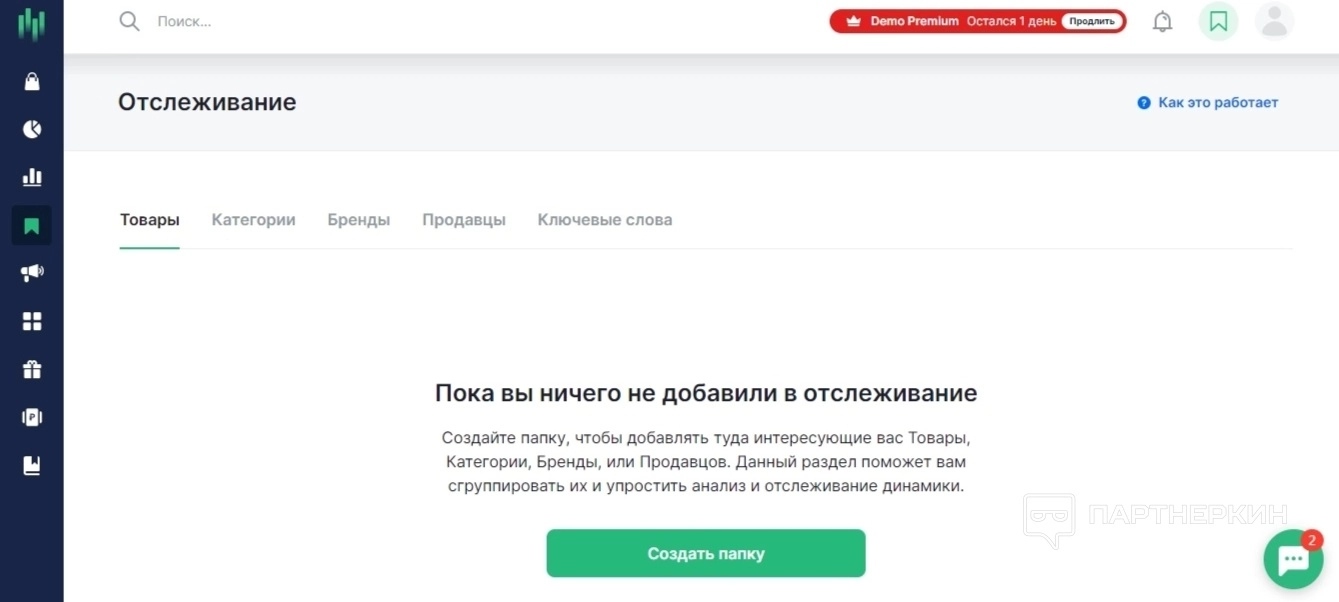 Следующий раздел — Отслеживание . Здесь пользователь может следить за конкретными товарами, категориями, брендами или продавцами, а также ключевыми словами. Раздел отличается от предыдущих за счет анализа только выбранных самим владельцем аккаунта категорий. Достаточно в общем топе товаров или слов выбрать подходящее и добавить в отслеживание.
