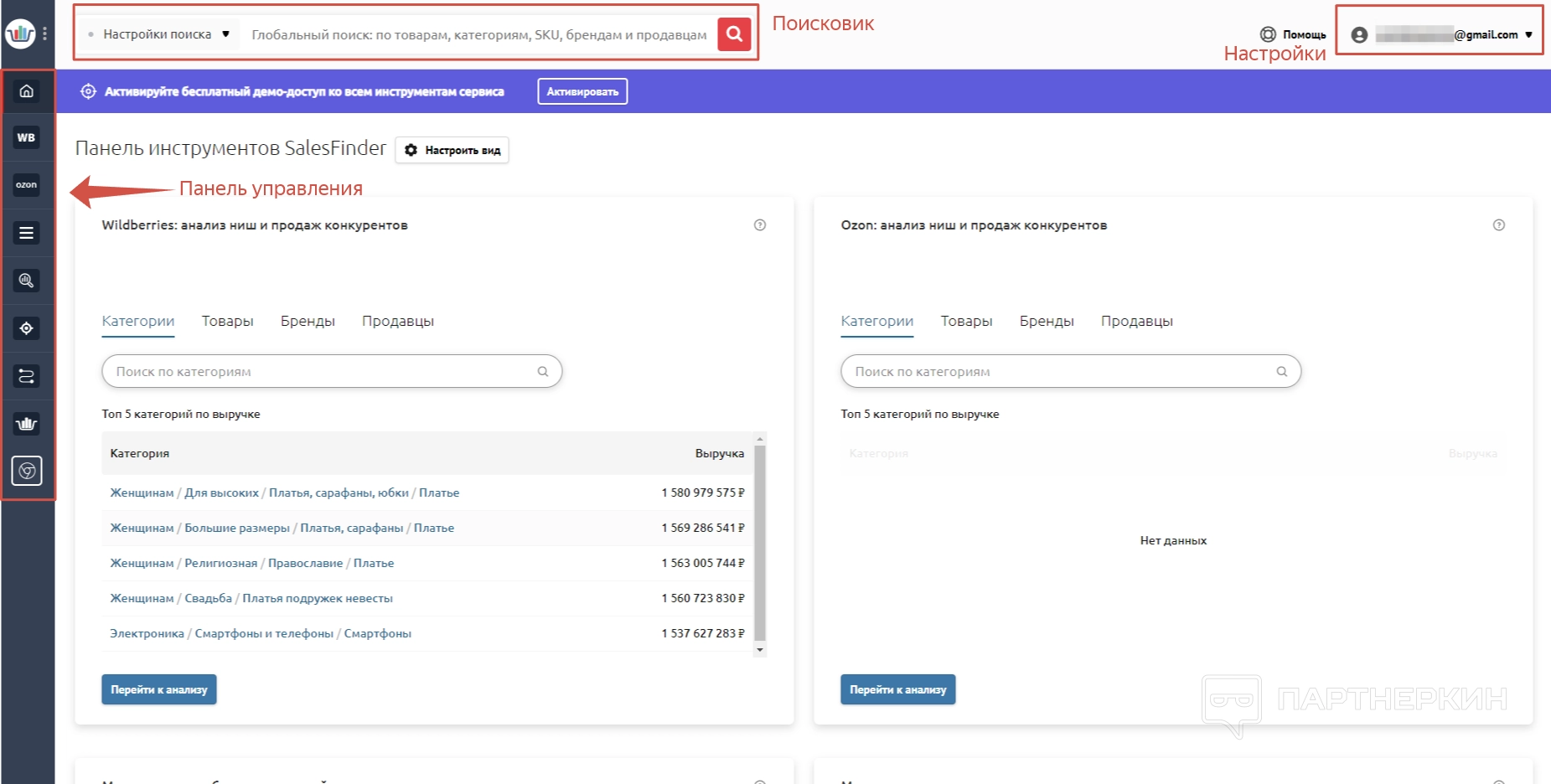 - панель управления — здесь находятся все инструменты для работы с маркетплейсами;