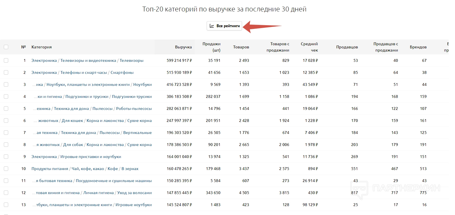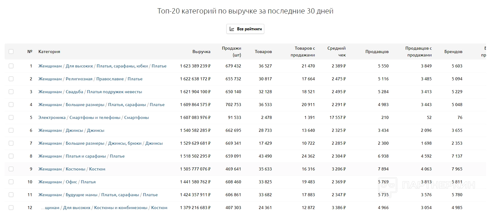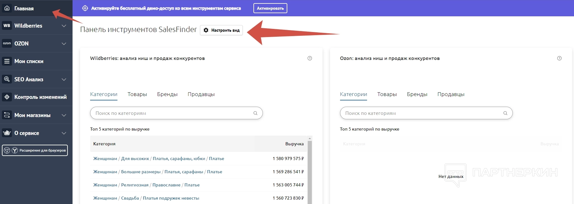 В OZON можно анализировать следующие категории: