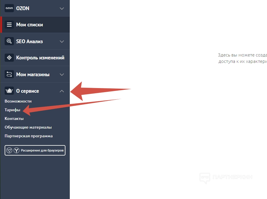 Чтобы приобрести тариф, переходим в раздел «О сервисе» и выбираем вкладку «Тарифы».