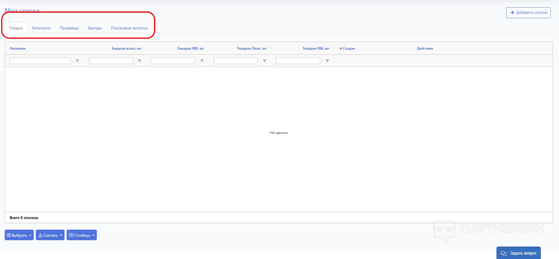 - Выбор раздела . В этом меню можно выбрать тип списка — товары, категории, продавцы, бренды или поисковые запросы.