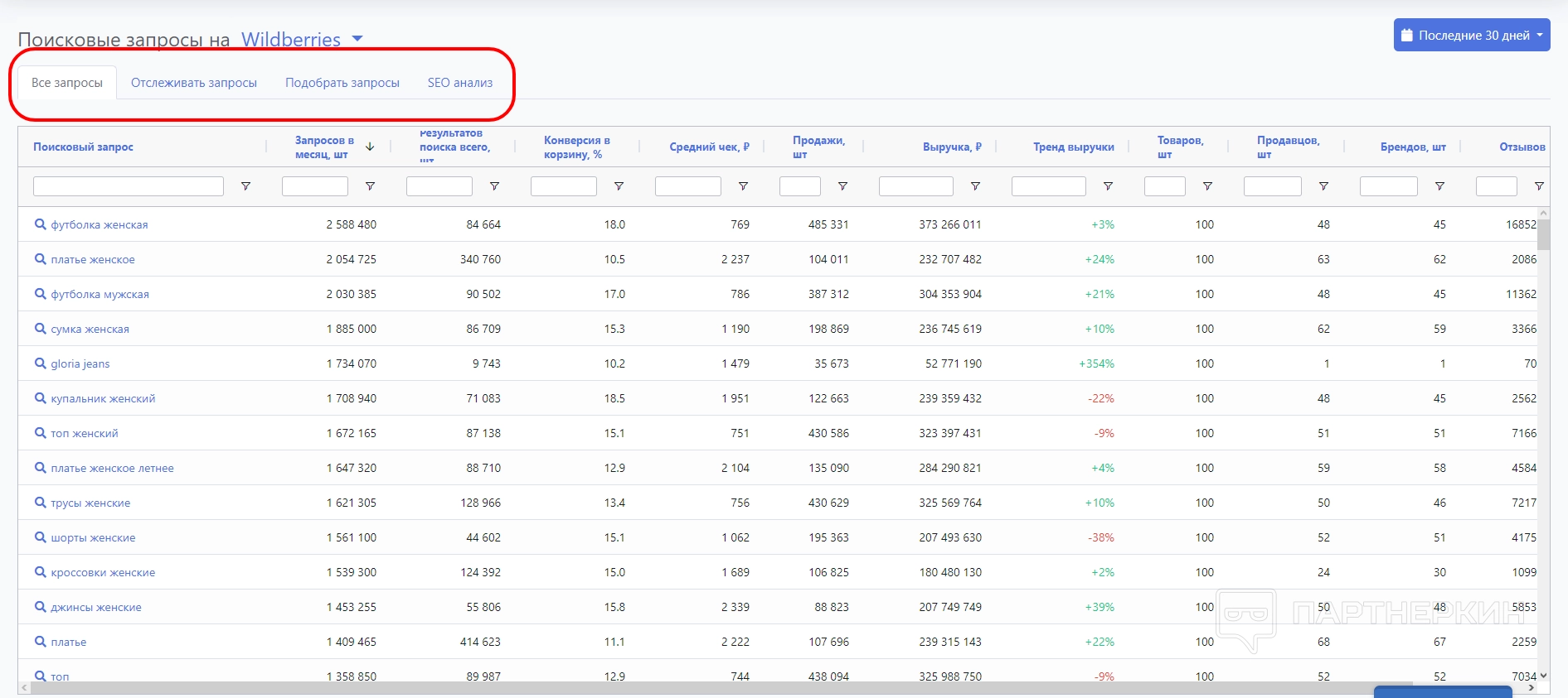 - Все запросы . Здесь отображаются все поисковые запросы выбранного маркетплейса.