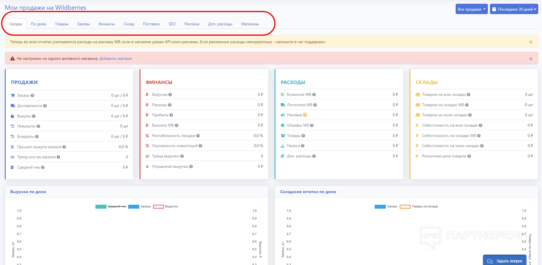 - Сводка . В этом разделе представлена сводная статистика продаж, а также графики выручки и складских остатков по дням.